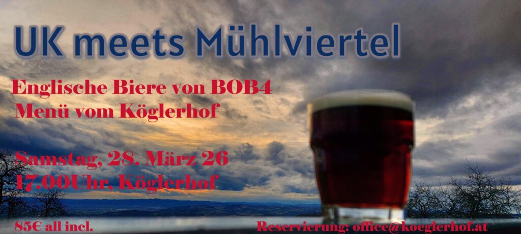 Aus der Serie “Bier und Foodpairing” gibt es nun einen neuen Aromenworkshop mit BOB4 (Brotherhood of four Brewers) und Köglerhof. Entdecke mit uns die Aromenwelt rund ums Bier. Unsere Reise führt uns zu englischen Bierstilen und Elementen der typischen Pubkultur auf der Insel.